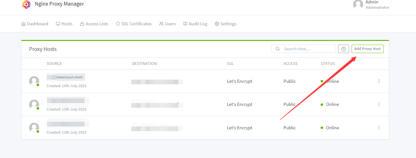 安装完成后,在 Nginx Proxy Manager 的 Web 界面上,点击添加按钮,添加代理。